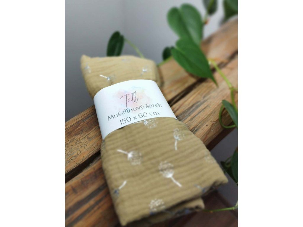 Rozměr: 150 x 60 cm - šátek je trojúhelník, rozměr 60 cm je v nejširším místě